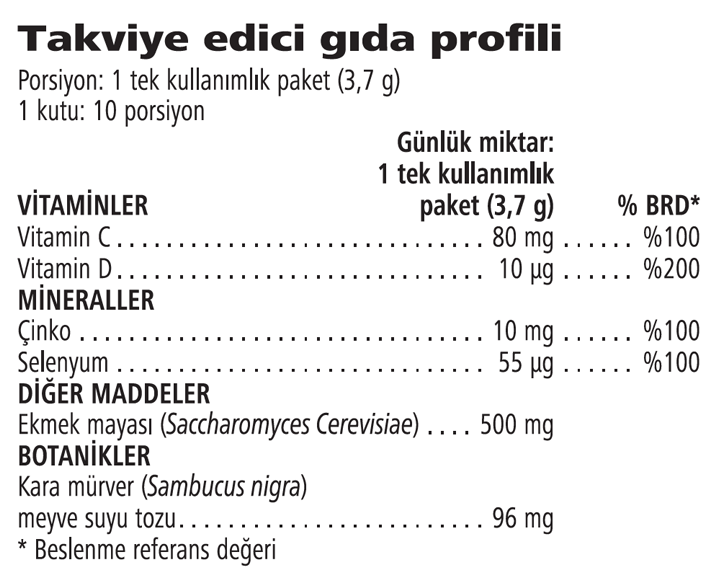 Maltodekstrin, ekmek mayası (Saccharomyces cerevisiae), kara mürver (Sambucus nigra) meyve suyu tozu, asitlik düzenleyici (sitrik asit), kıvam arttırıcı (ksantan gam, akasya gamı), L-askorbik asit, aroma verici, renklendirici (pancar kökù kırmızısı), çinko sitrat, tatlandırıcı (sukraloz), kolekalsiferol, topaklanmayı önleyici (silikon dioksit), sodyum selenit.