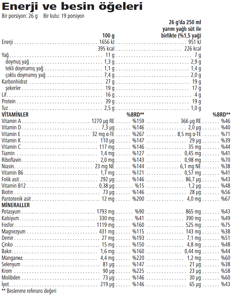 *250 ml yarım yağlı süt (% 1,5 yağlı) ile hazırlandığında.